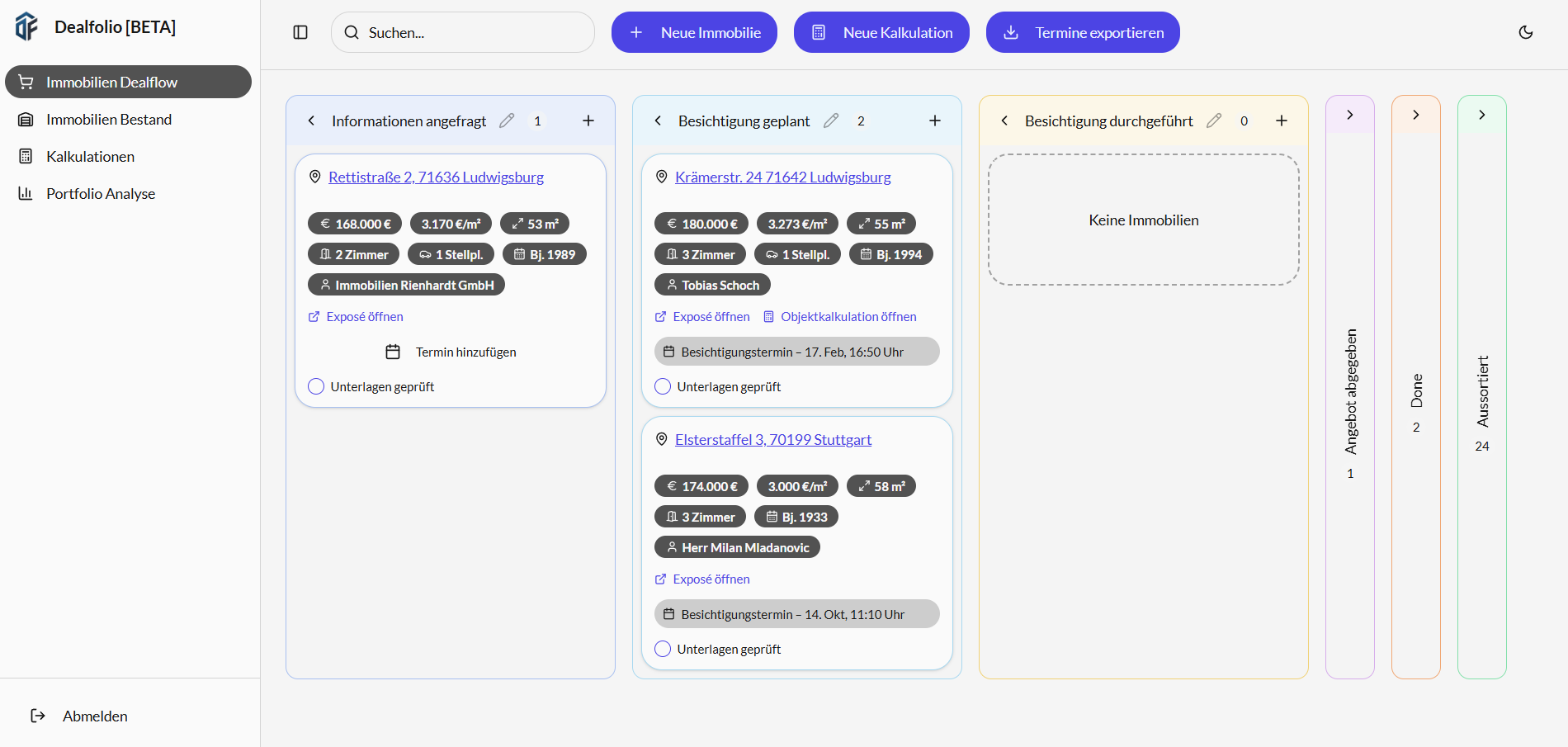 Dealfolio ist eine webbasierte Software für private Immobilien-Kapitalanleger in Deutschland. Verwalten Sie Ihre Objektakquise, Kalkulationen und Ihr Portfolio an einem Ort.